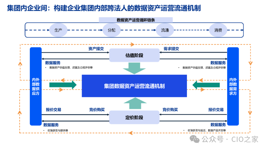 集团内企业间:构建企业集团内部跨法人的数据资产运营流通机制,实现数据资产的生产、分配、流通和消费,建立数据资产估值和定价机制 。