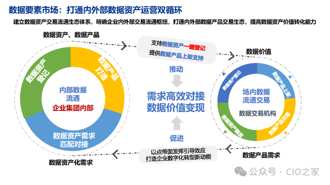 数据要素市场:打通内外部数据资产运营双循环,建立数据资产交易流通生态体系,实现数据价值变现 。