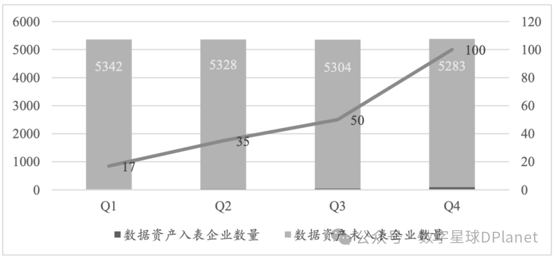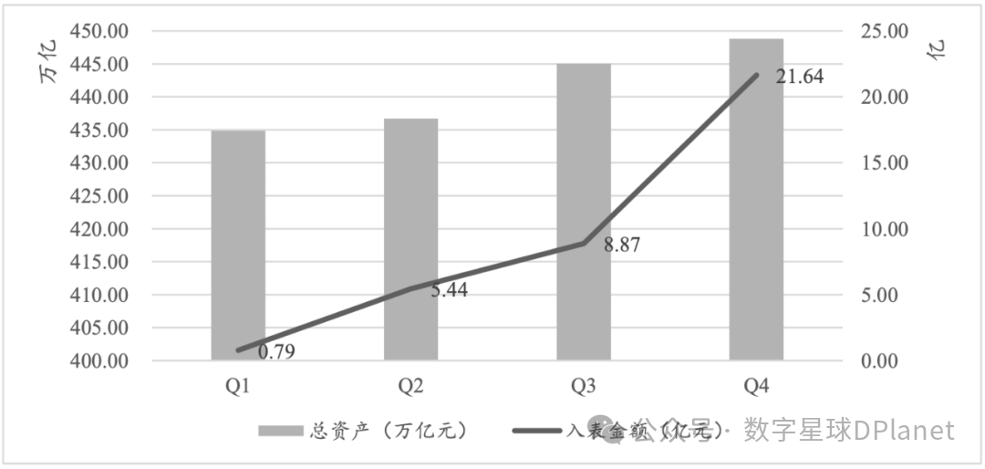 自《暂行规定》正式施行以来,上市公司从2024年第一季度开始便陆续有数据资产入表动作。本文统计了自一季度报告到年度报告中进行数据资产入表的企业数量及上市公司总数,见图1。在统计过程中,本文剔除了存在较大错披风险的公司,例如,数据资源存货或数据资源无形资产余额等同其一级科目总额,但根据其业务实质判断并不相符;表内披露与附注内容无法相互验证。最终,2024年年底共计100家上市公司披露约21.64亿元数据资产。