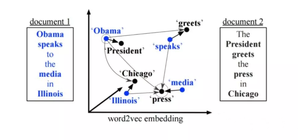 那么词到词之间的距离,即如 Distance("Obama"->"President")该怎么计算呢?很明显我们第一步的词向量模型已经为此实行了铺垫。