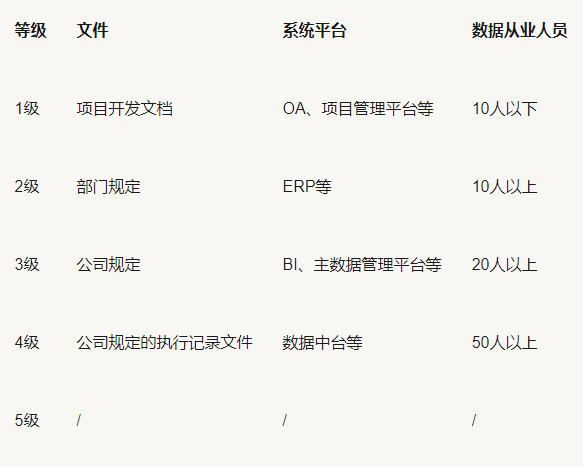 DCMM评估包含的内容也非常多,这里只能顺利获得一些内容做一个简单的判断(由于DCMM是向下兼容的,所以申请高等级的评估同时需要满足低等级的要求)。