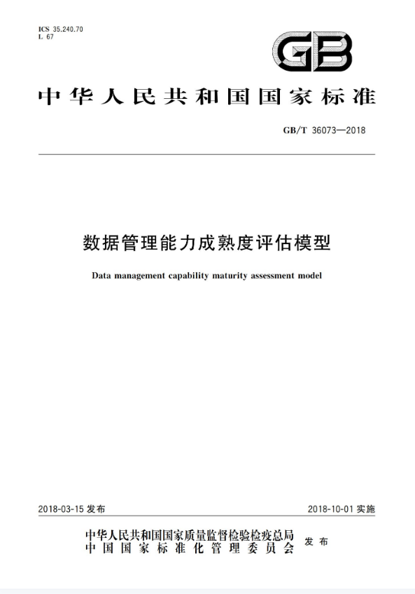 数据管理能力成熟度评估模型》(GB/T 36073-2018)国家标准,英文名称Data management Capability Maturity Model。