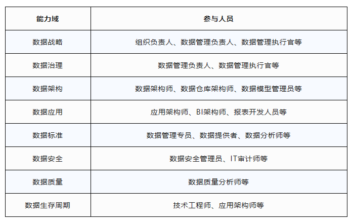 从企业评估过程中来看,一般来说,数据战略和治理需要的是管理人员,其余6个能力域需要的是技术人员,从实际评估角度来说,企业匹配人员一般在3-8个,在申请比较低的等级过程中,一个人可以覆盖2~3个能力域。