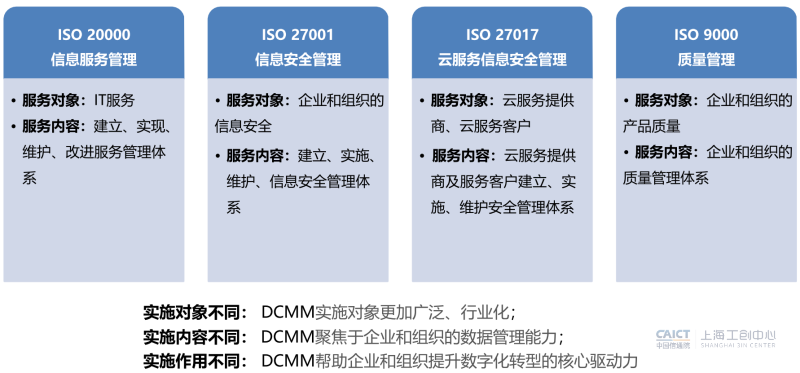 DCMM与ISO、CMMI相比,一是评估对象更加广泛和行业化;二是评估内容聚焦于企业和组织的数据管理能力;三是评估作用帮助企业和组织提升
