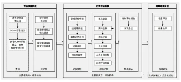 DCMM评估流程分为评估准备、正式评估和结果评议三个阶段。