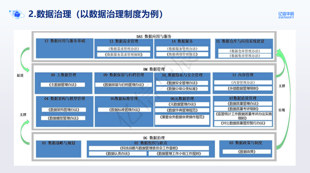 数据治理是DCMM数据管理框架的核心职能,是对数据资产管理行使权利和控制的活动集合,数治理涉及到数据管理的组织、标准规范、流程、架构等多个方面。数据管理的其他关键过程域都有交互,数据治理是在高层次上制定、执行数据管理的制度。数据治理能力域包括数据治理组织、数据制度建设、数据治理沟通三个能力项。