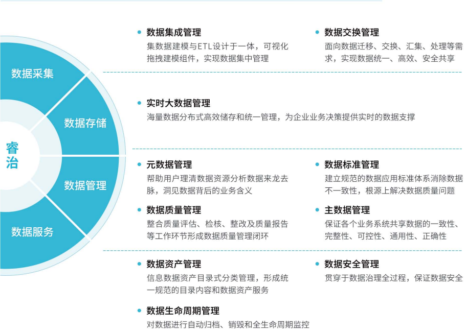 1)数据治理:含数据治理十大模块。睿治智能数据治理工具由Ebpay自主研发,融合实时计算存储、数据集成管理、数据交换管理、实时计算存储、元数据管理、数据标准管理、数据质量管理、主数据管理、数据资产管理、数据安全管理、数据生命周期管理十大产品模块,各产品模块可独立或任意组合使用,打通数据治理各个环节,可快速满足政府、企业用户各类不同的数据治理场景。