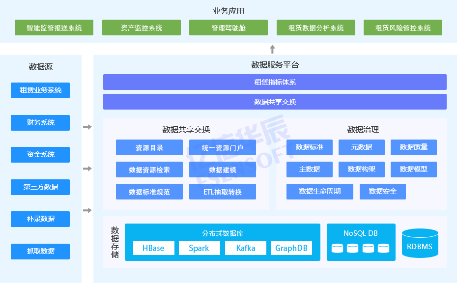 覆盖租赁全行业业务范围,从监管报送、数据存储、数据模型、数据治理到数据应用,实现数据资产全生命周期管控。