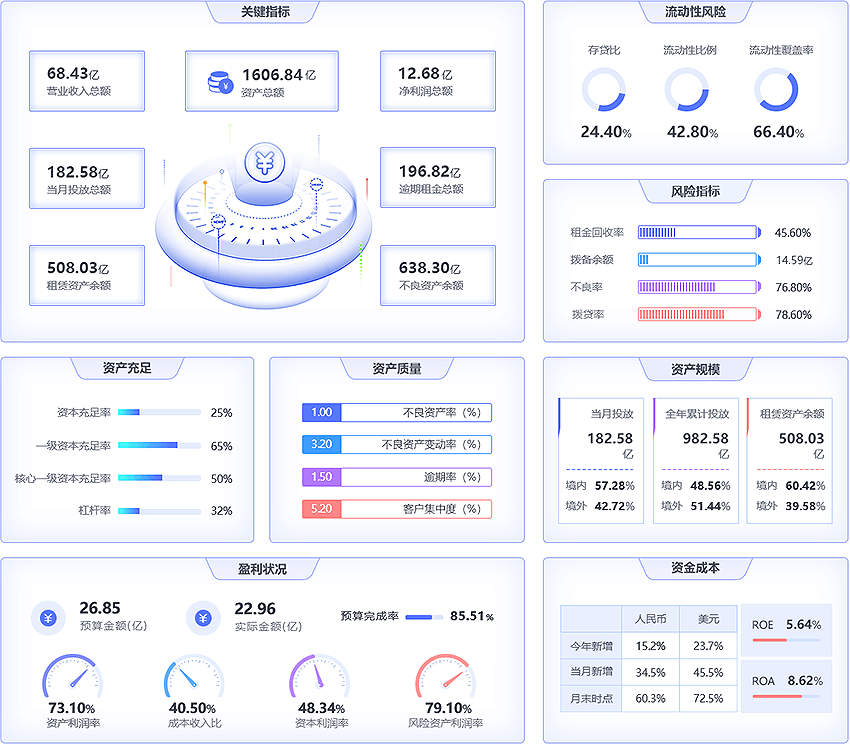 基于整合的租赁数据中心,依托于可视化BI工具,针对内部数据快速构建全套管理报表和数据分析体系,包括运营分析、风险分析、财务分析等企业日常分析展现。